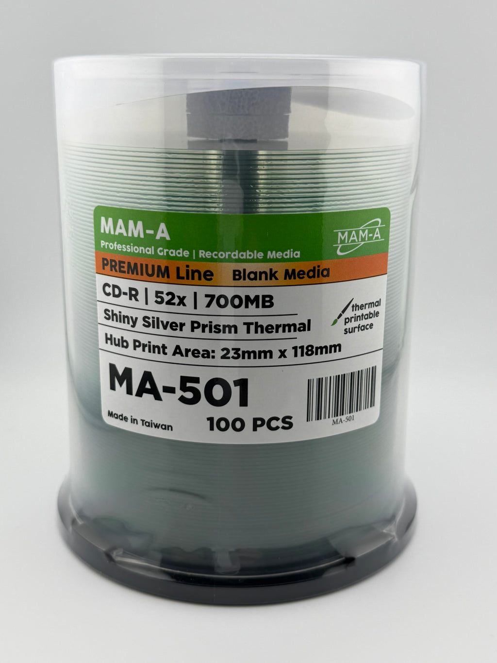 MAM-A Shiny Silver Prism Thermal CD-Rs deliver a superior white coat finish, optimized for crisp, vibrant inkjet printing. Designed for professional use, these discs combine excellent print quality with reliable performance.