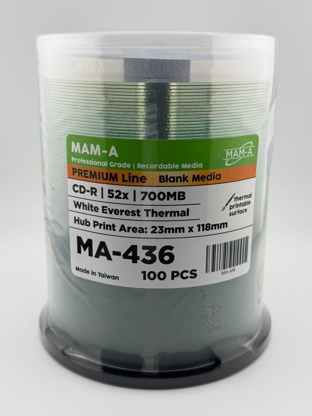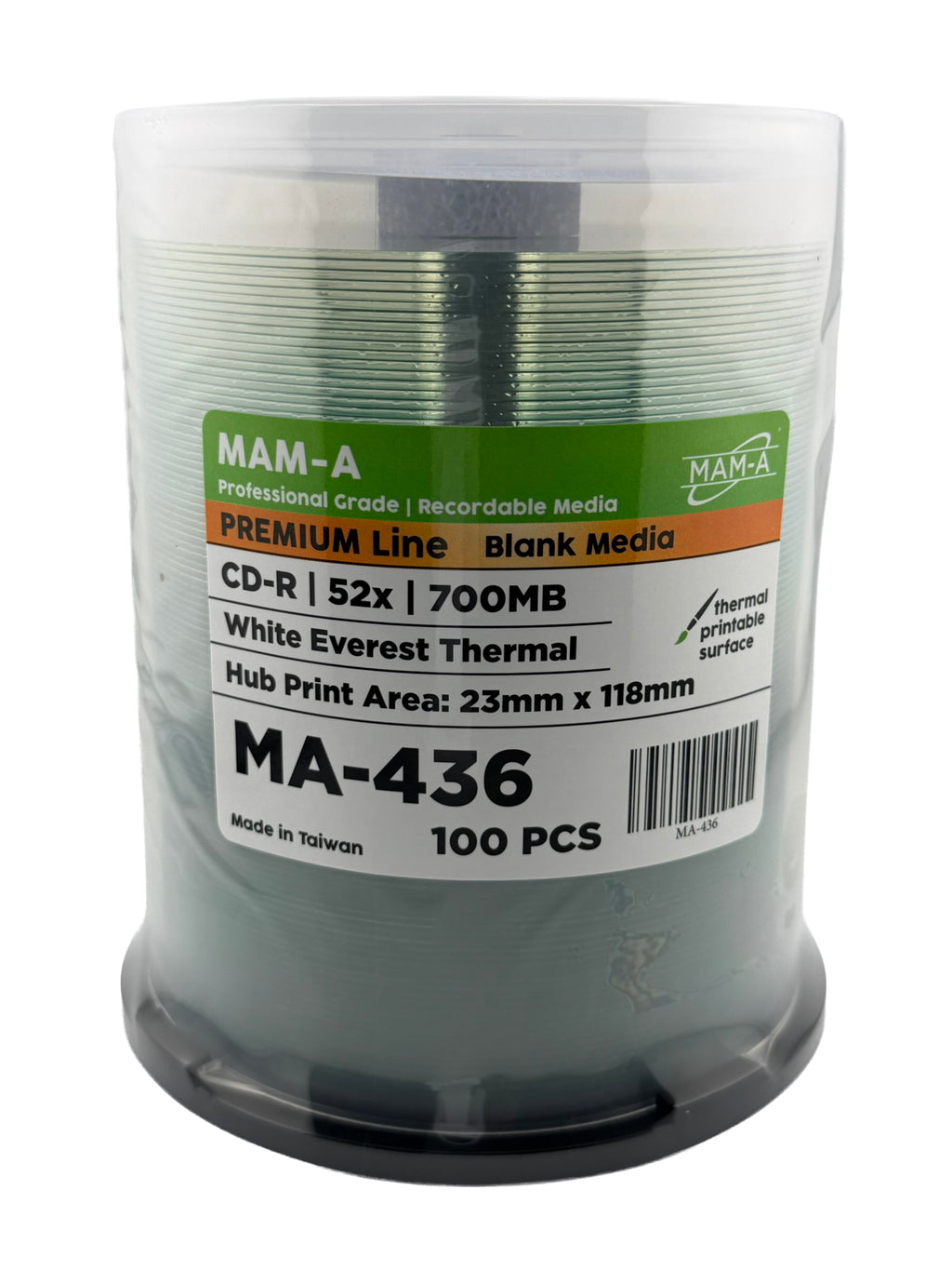MAM-A White Everest CD-Rs deliver a superior white coat finish, optimized for crisp, vibrant inkjet printing. Designed for professional use, these discs combine excellent print quality with reliable performance.