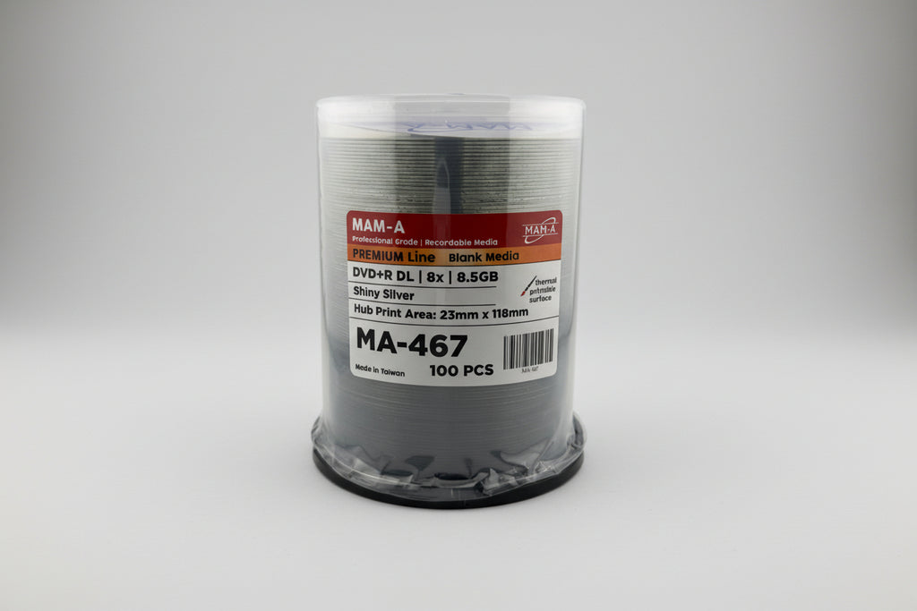 MAM-A Premium Dual Layer Shiny Silver DVD+R DLs deliver a superior white coat finish, optimized for crisp, vibrant inkjet printing. Designed for professional use, these discs combine excellent print quality with reliable performance.