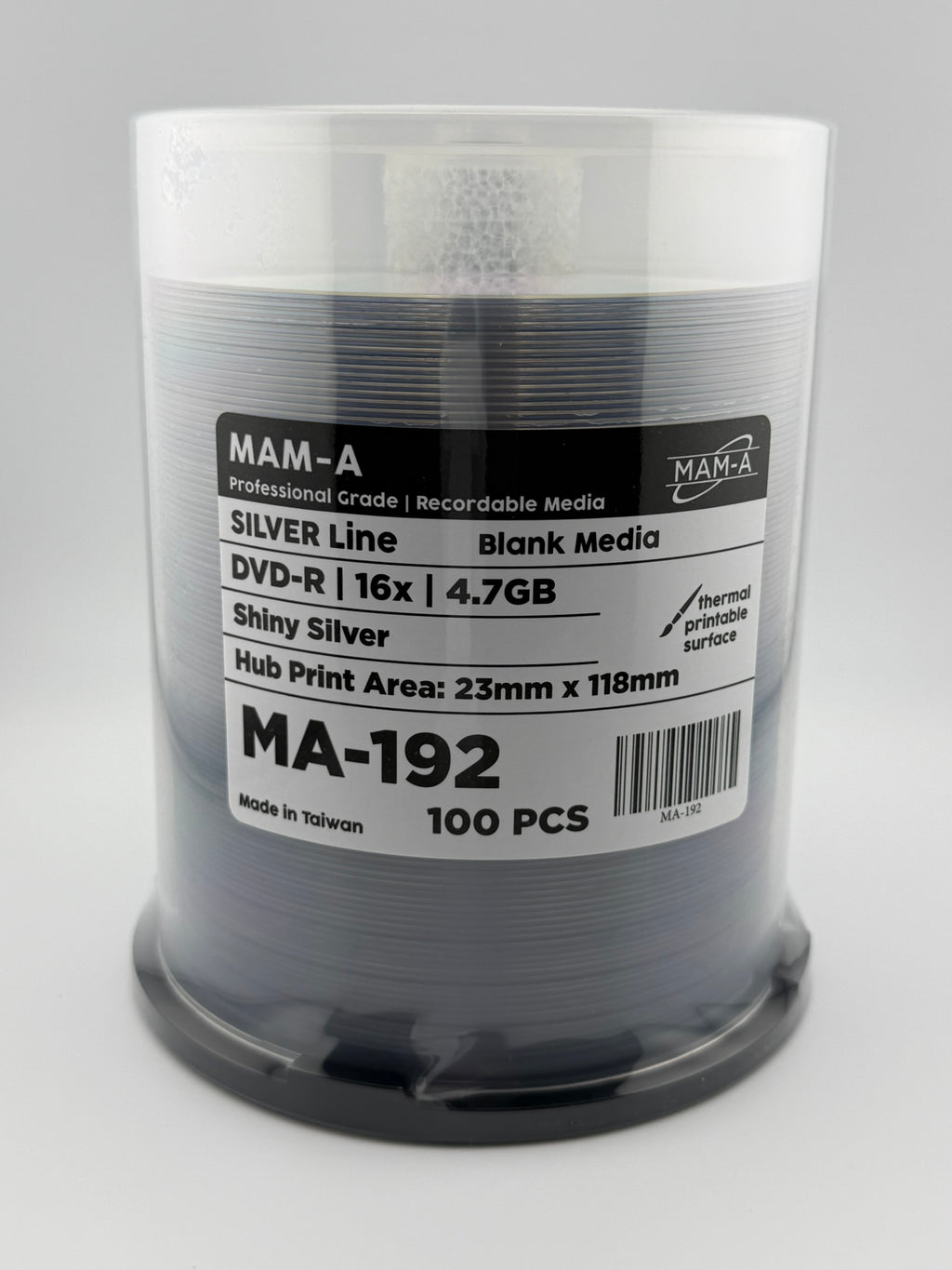 MAM-A Shiny Silver Line DVD-Rs deliver a superior silver coat finish, optimized for crisp, vibrant thermal printing. Designed for everyday use, these discs combine excellent print quality with reliable performance.
