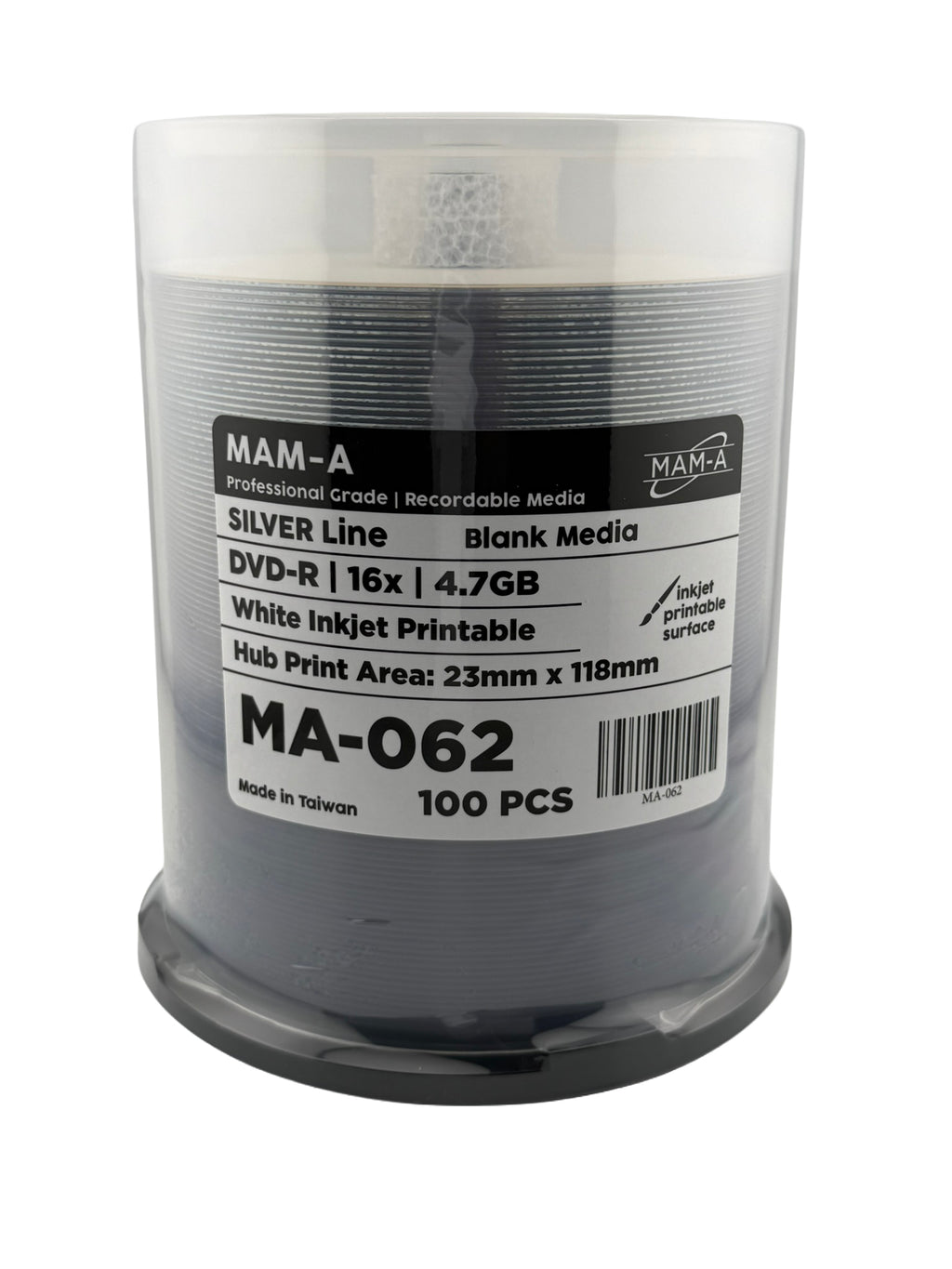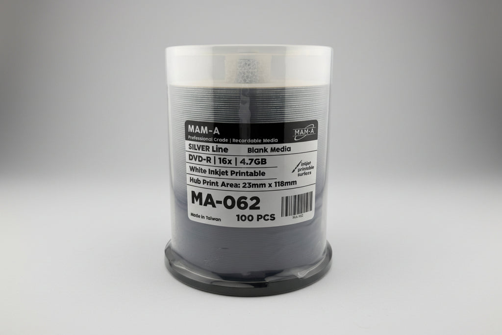 MAM-A White Inkjet Silver Line DVD-Rs deliver a superior silver coat finish, optimized for crisp, vibrant inkjet printing. Designed for everyday use, these discs combine excellent print quality with reliable performance.